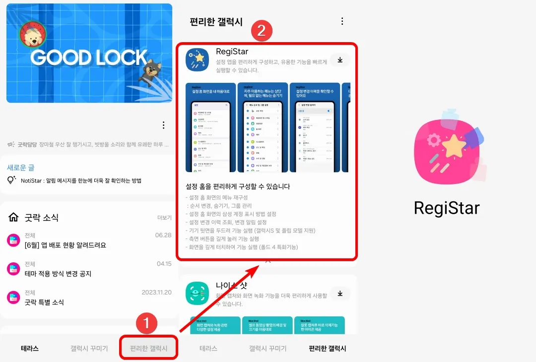 Good Lock 앱을 실행하면 아래의 그림과 같이 "편리한 갤럭시" 탭에서 부가기능인 "RegiStar"을 찾아서 설치한 다음 실행해 주세요.