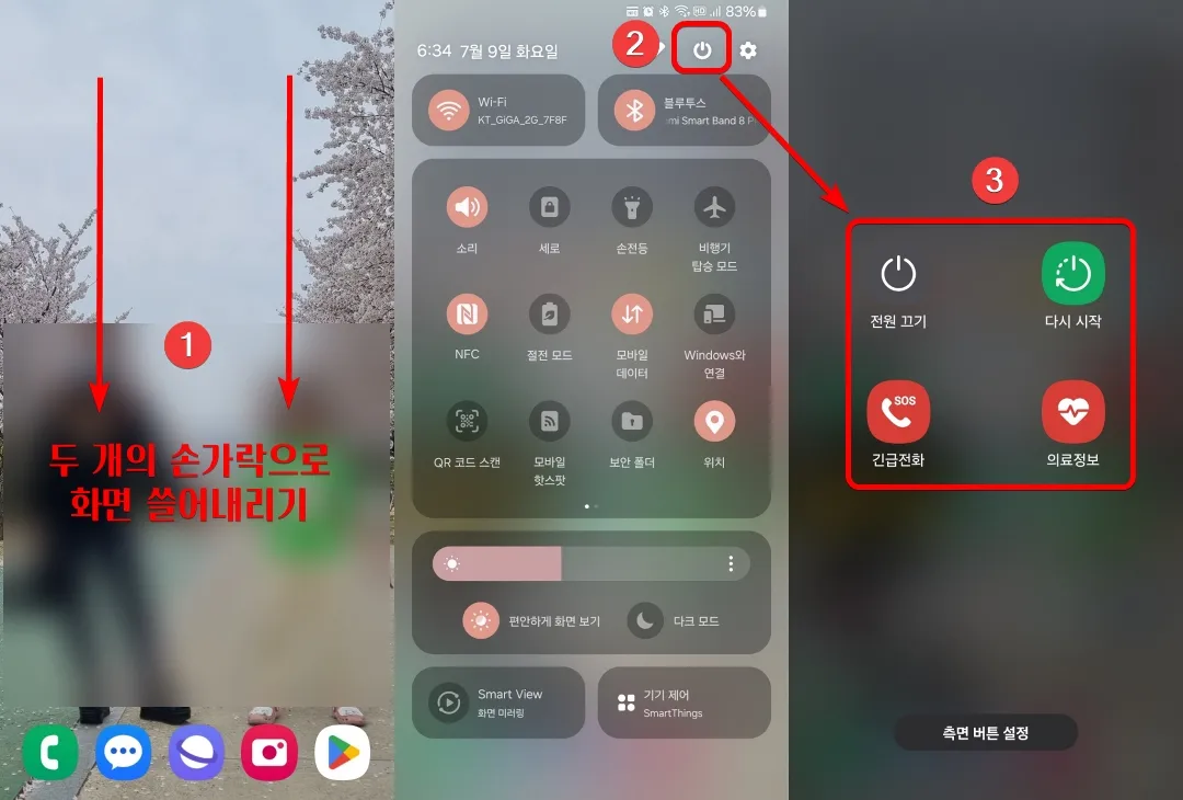 갤럭시 휴대폰 상단을 두 개의 손가락으로 쓸어내리면 휴대폰의 여러 가지 기능을 제어할 수 있는 제어센터가 나타납니다. 제어센터 우측 상단에 전원 모양의 아이콘을 선택하면 휴대폰 전원 끄기 및 재부팅할 수 있는 메뉴가 나타납니다.