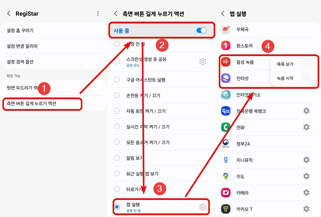 Good Lock 부가기능 RegiStar를 실행합니다. 아래의 그림처럼 "측면 버튼 길게 누르기 액션"이라는 메뉴를 선택해서 사용으로 변경하고, 앱 실행을 선택합니다. 앱 실행에서 "음성 녹음" 앱 옆에 톱니바퀴를 눌러서, "녹음 시작"을 선택하면 모든 설정이 완료됩니다.