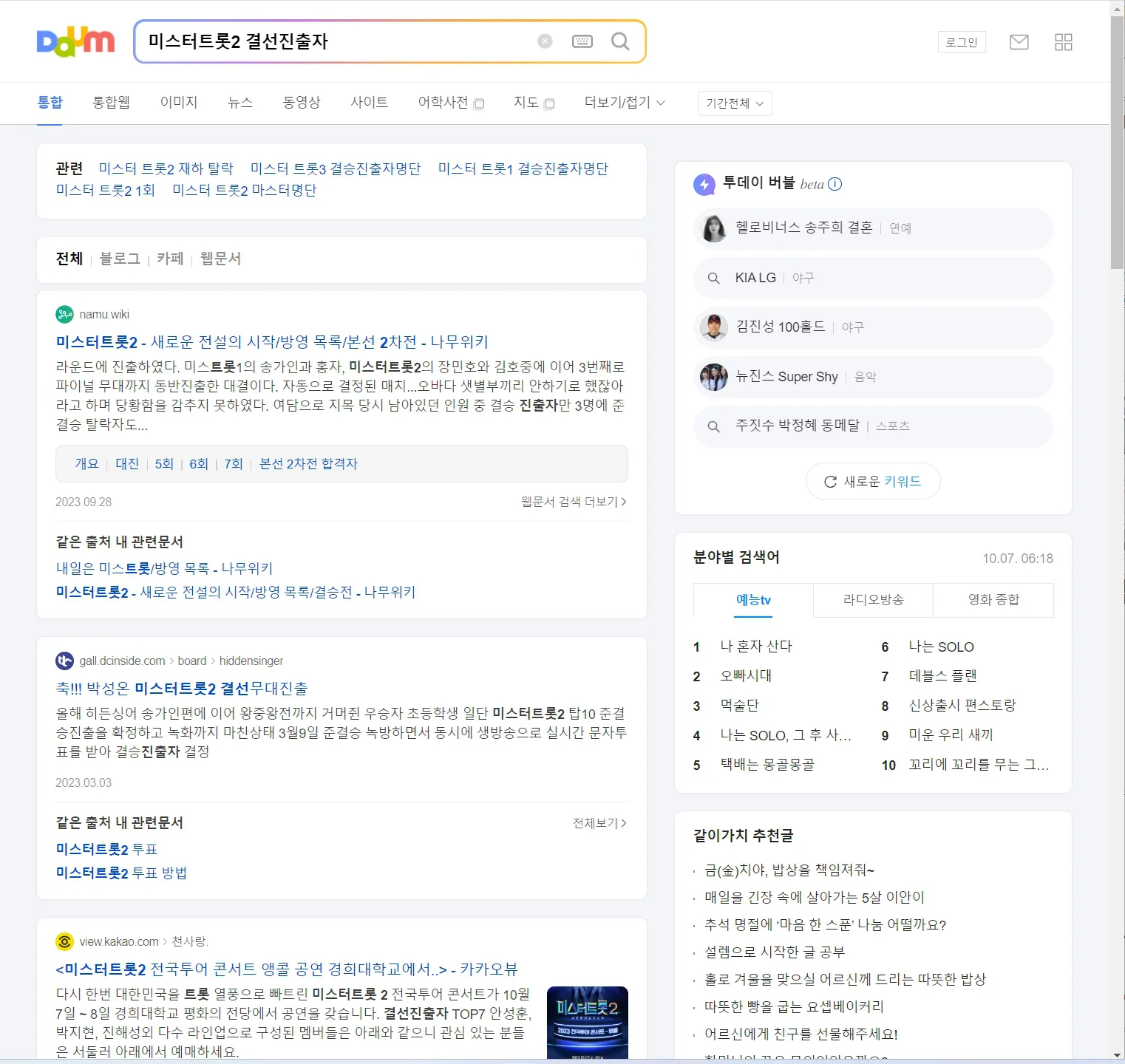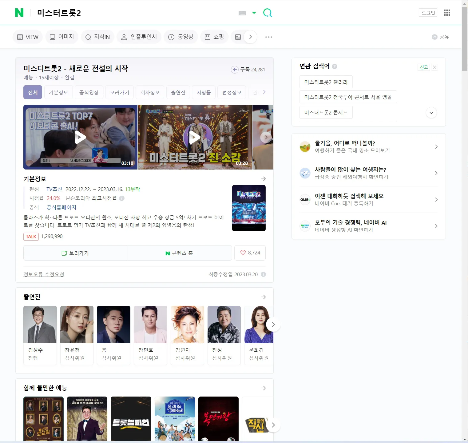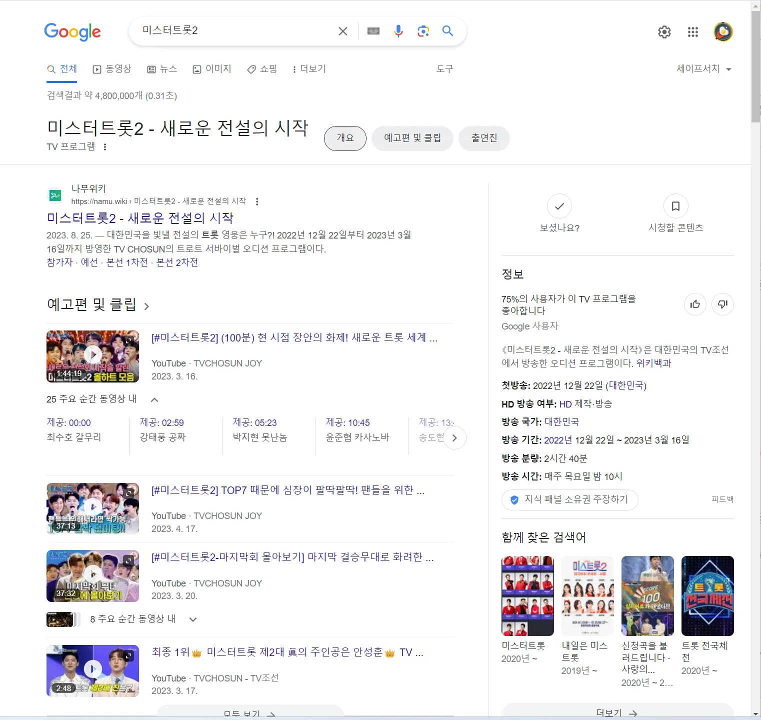 TV조선에서 방송했던 "미스터트롯 2"라는 방송 프로그램이 있는데 이 키워드를 구글, 네이버, 다음에서 검색해 보면 미스터트롯을 방송하는 방송사 홈페이지, 관련 동영상, 뉴스 등을 보여준 다음 관련된 블로그 글을 보여줍니다.