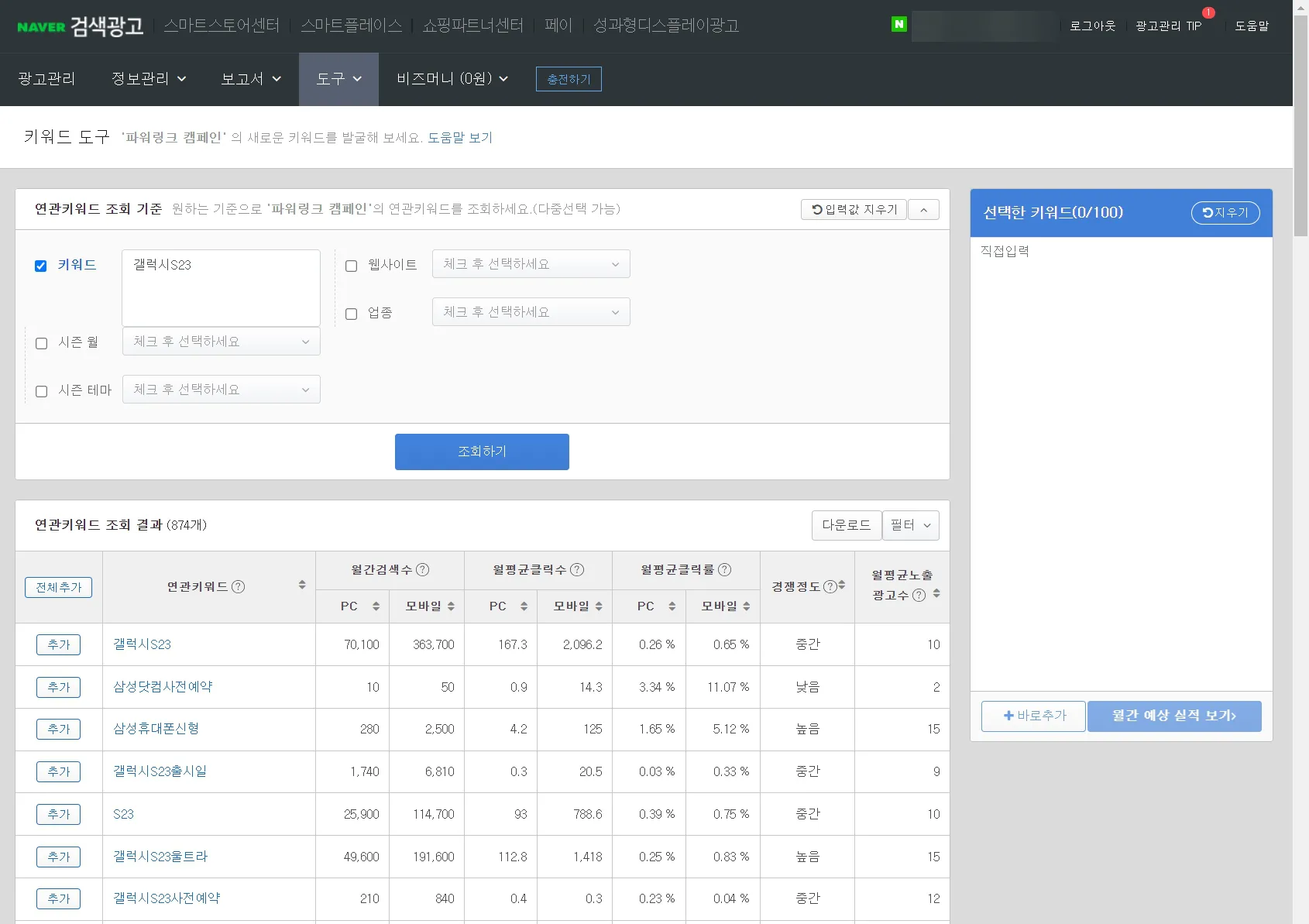 - 네이버 검색광고에서 "갤럭시 s23"을 검색한 결과 - 검색량 및 경쟁정도를 확인 가능