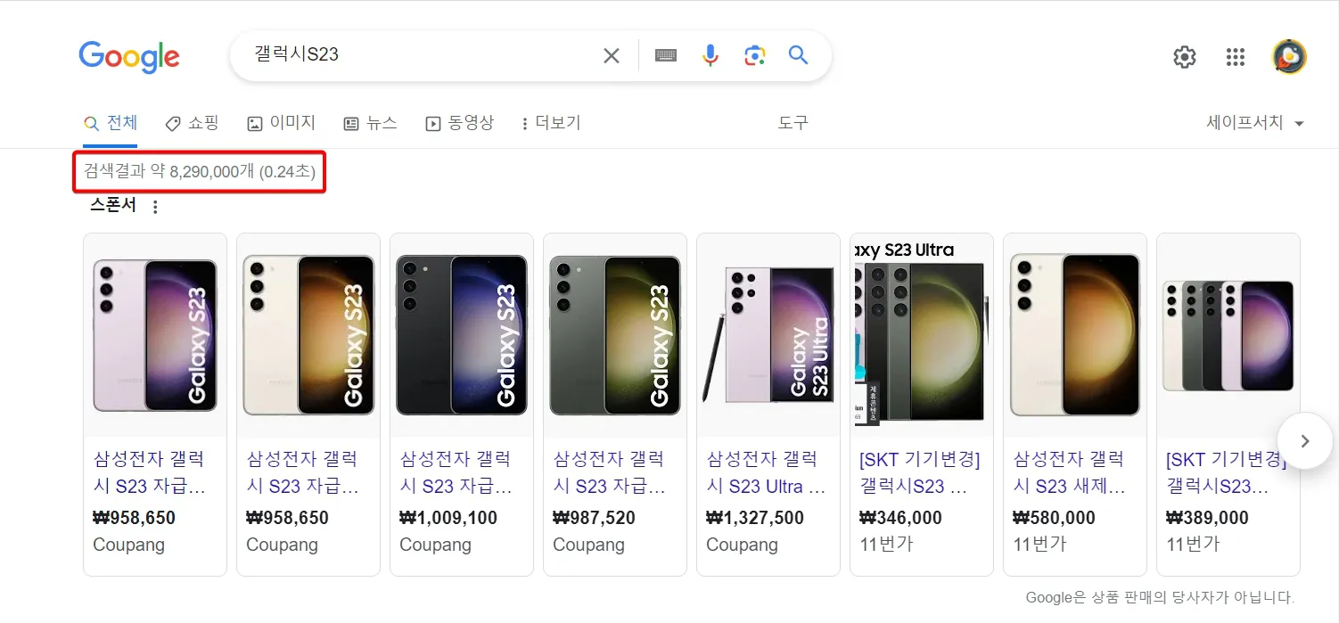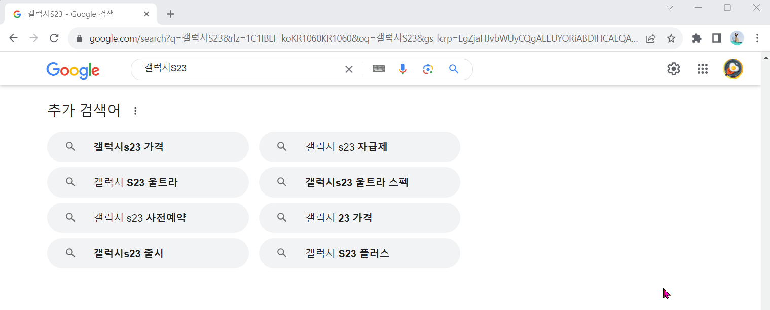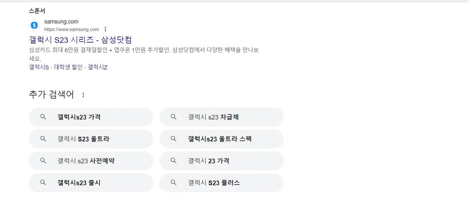 예를 들어서 구글에서 "갤럭시 S23"을 검색하면 검색결과 상단에 약 8백만 건의 문서가 있으며, 아래로 내려가면 "추가 검색어"라고 연관 검색어 리스트를 보여줍니다.