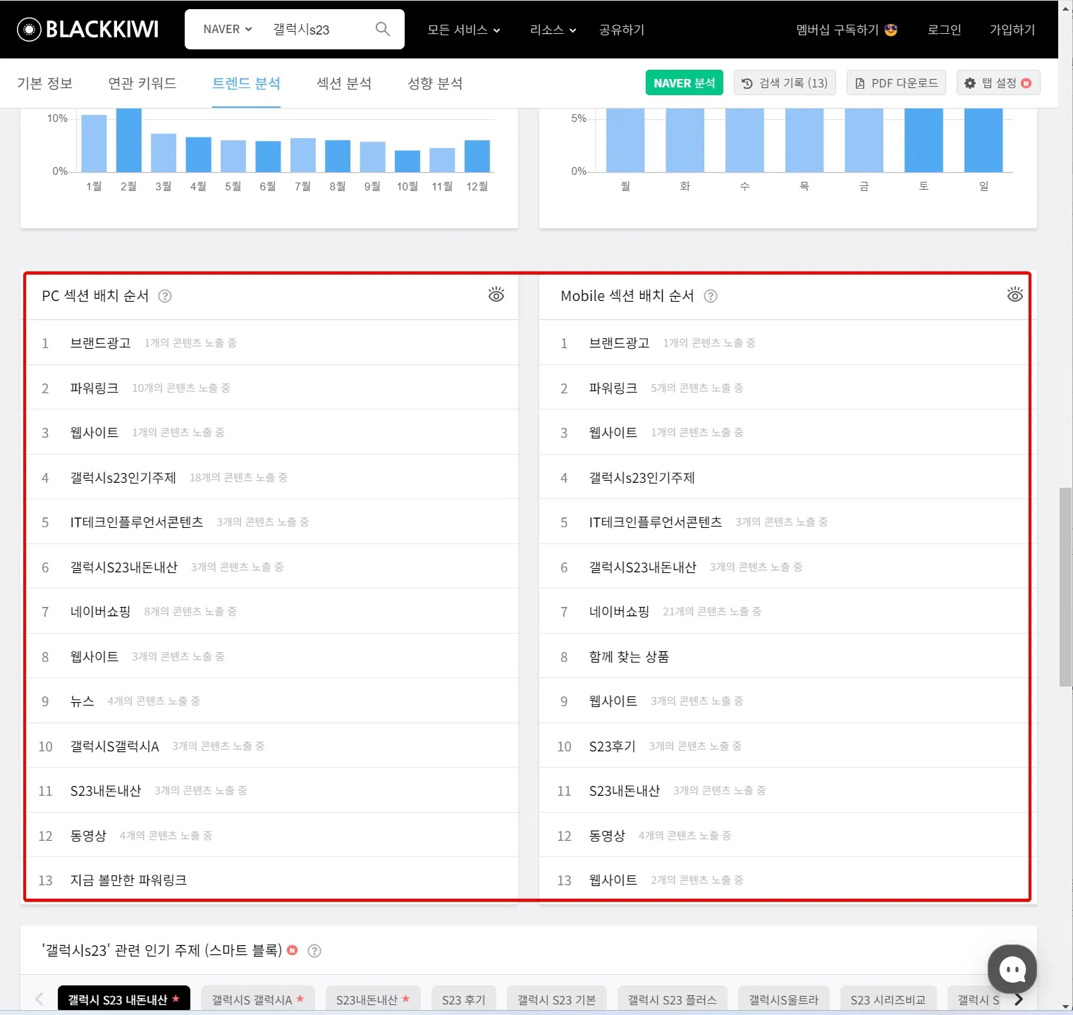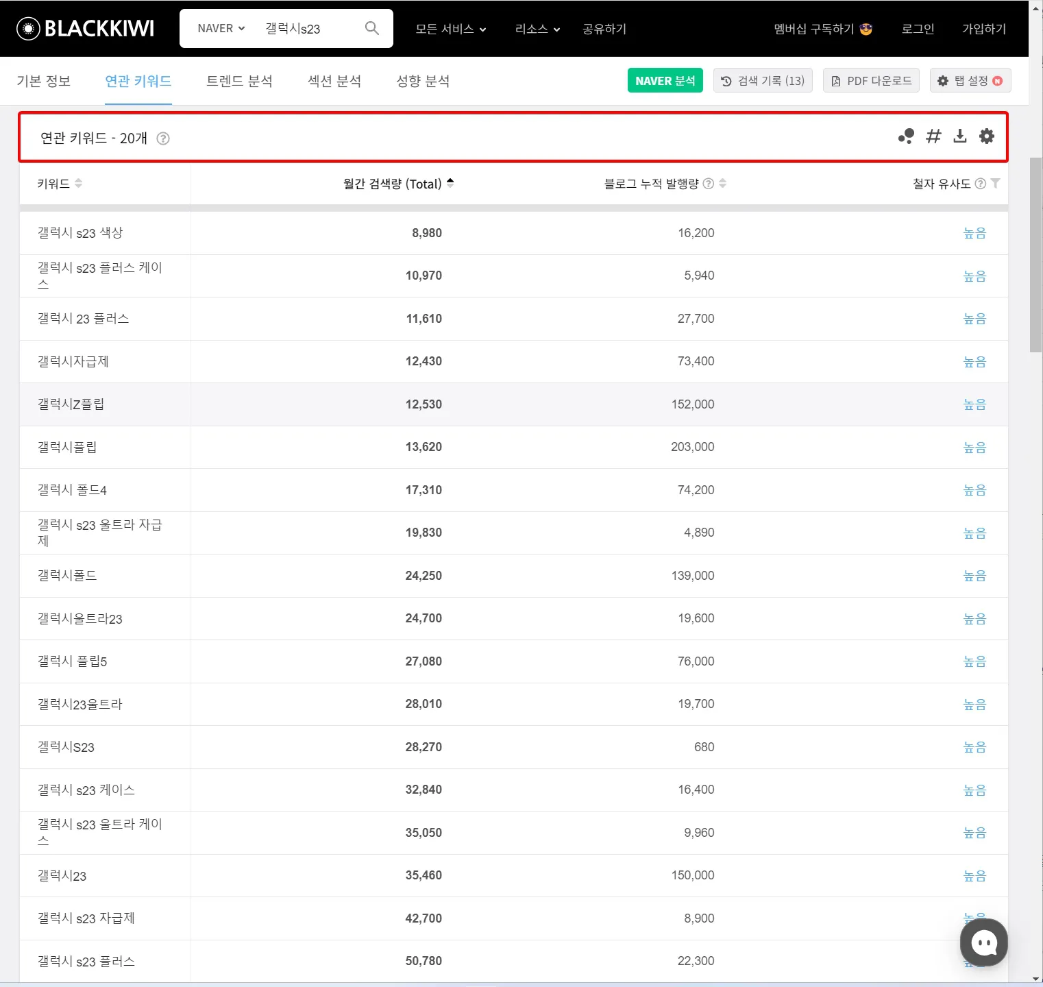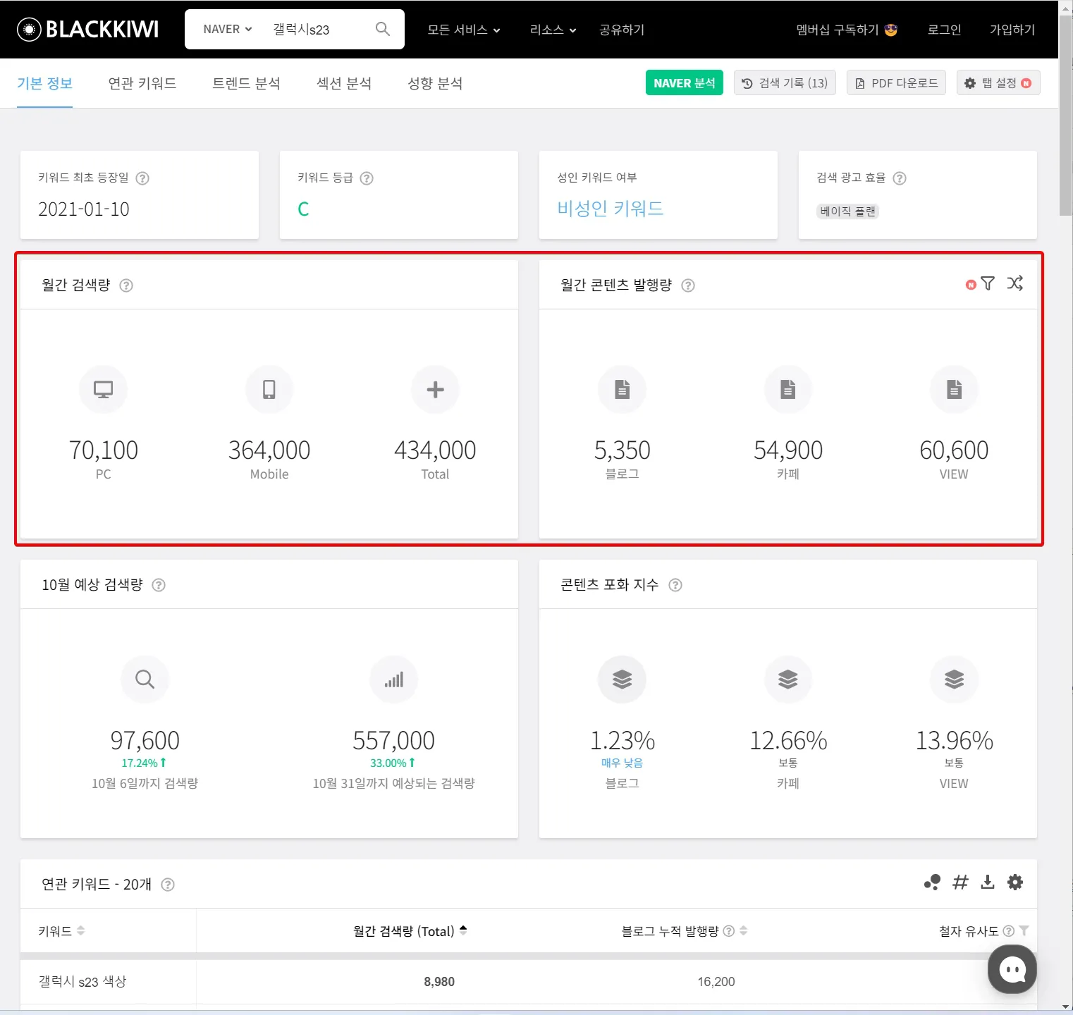 - 블랙키위에서 "갤럭시 s23"을 검색한 결과 - 검색량, 문서량, 연관 검색어, 검색결과 배치까지 확인 가능