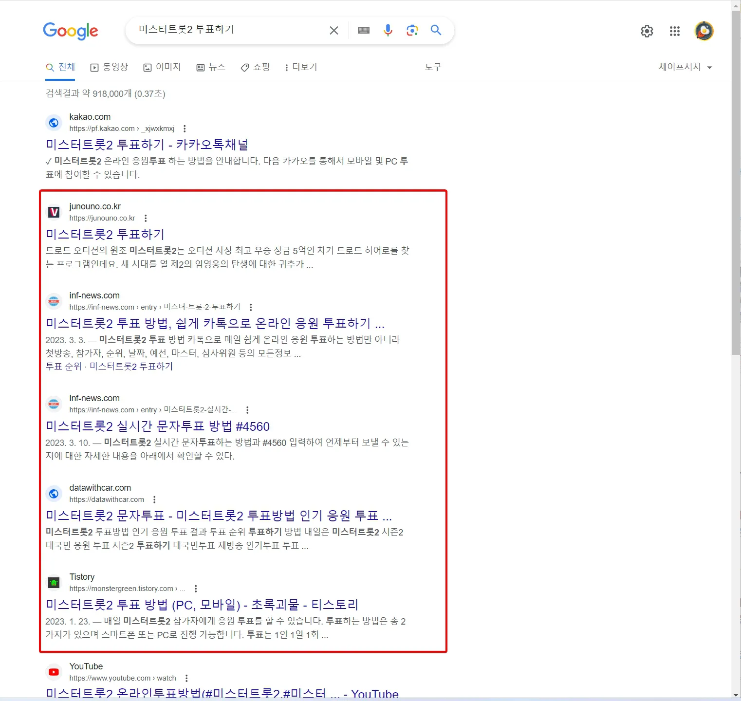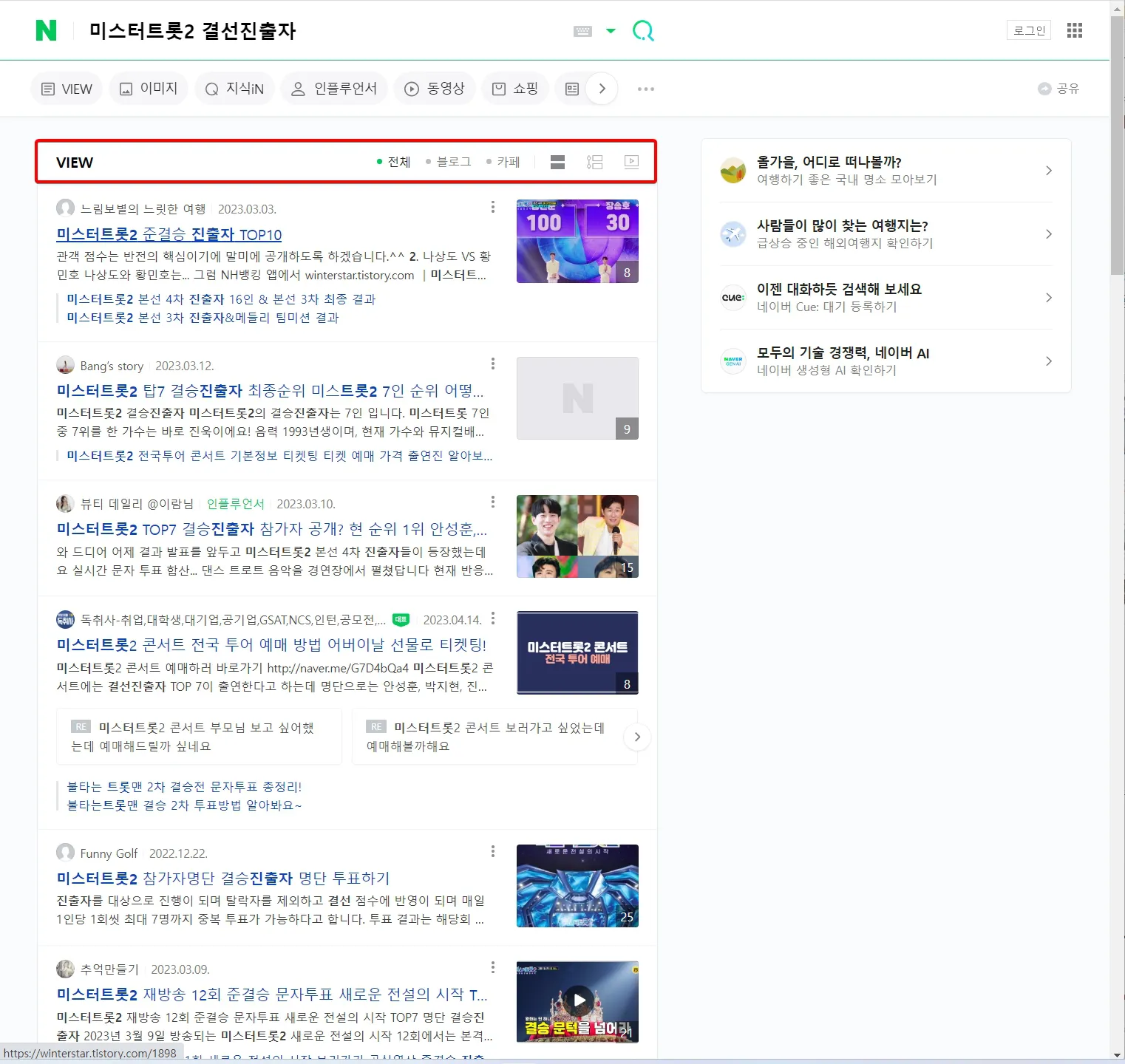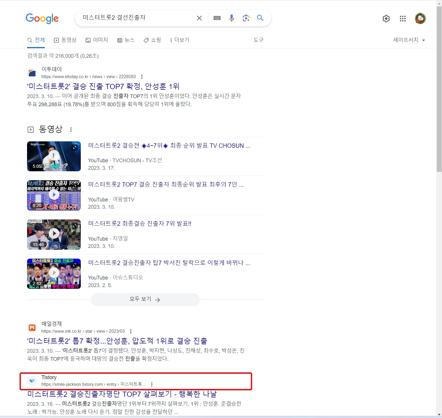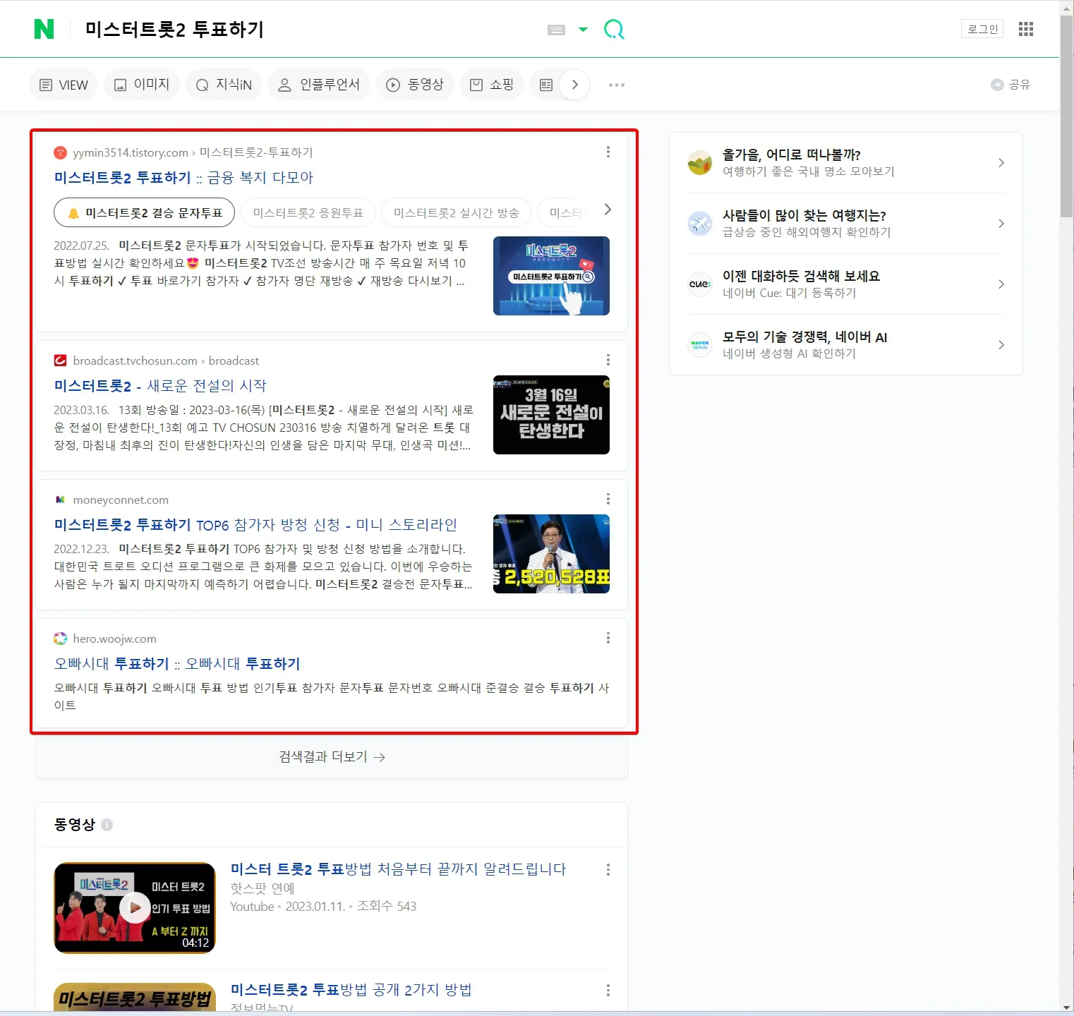 메인 키워드 "미스터트롯 2"에 연관된 키워드 중에서 "결선진출자", "투표하기"라는 추가 키워드를 포함해서 검색하는 경우 아래에 있는 그림처럼 구글, 네이버에서는 해당 키워드와 관련된 블로그 글을 검색결과 상단에 배치시켜주고 있네요.
