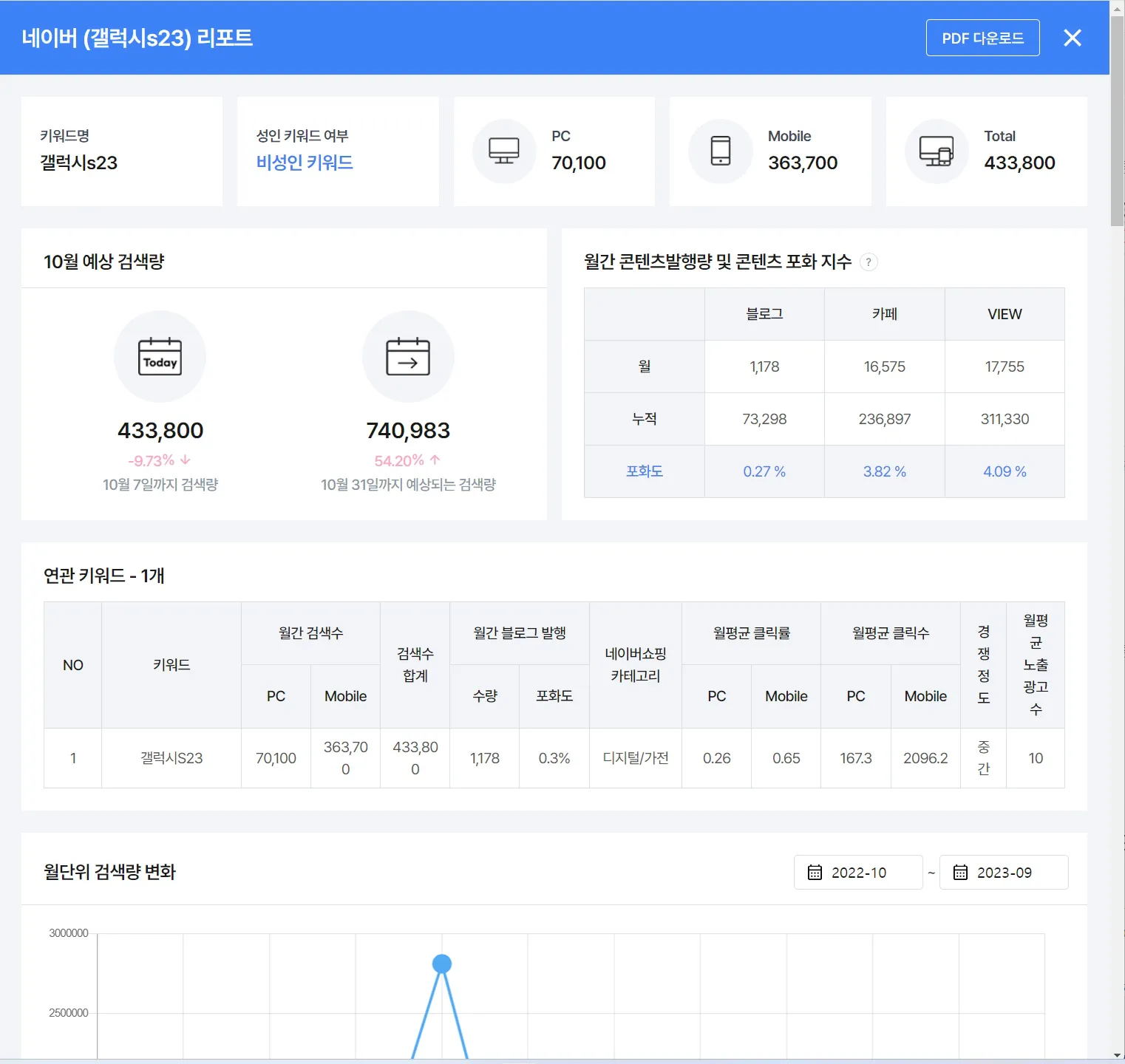 - 마피아넷에서 "갤럭시 s23"을 검색한 결과 - 검색량, 문서량, 검색결과 배치까지 확인 가능