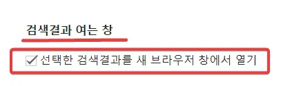 검색 설정 아래쪽을 보면 검색 결과 여는 창이라는 옵션이 있습니다. 이 옵션을 체크해 주면 검색 결과를 클릭했을 때 링크를 네이버, 다음 검색 엔진처럼 새창으로 열게 됩니다.