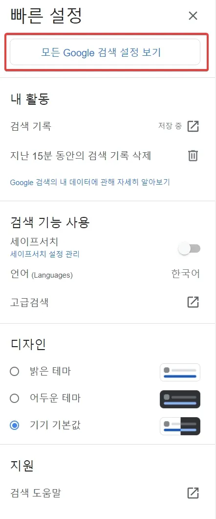 빠른 설정이 열리면 [모든 Google 검색 설정 보기]을 클릭하세요. 구글 검색 엔진 결과에 대한 설정값을 변경할 수 있습니다.