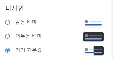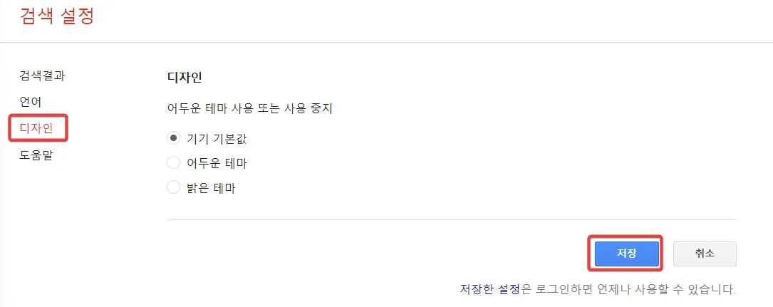 구글 검색 엔진 테마의 변경은 [빠른 설정] 메뉴에서 하거나 [검색 설정] - [디자인]에서 할 수 있습니다.