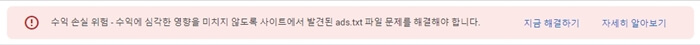 몇 번의 승인 거절을 당하고 힘들게 애드센스 승인을 받았는데 "수익 손실 위험 - 수익에 심각한 영향을 미치지 않도록 사이트에서 발견된 ads.txt 파일 문제를 해결해야 합니다."라는 무서운 경고 문구를 보게 되었습니다.