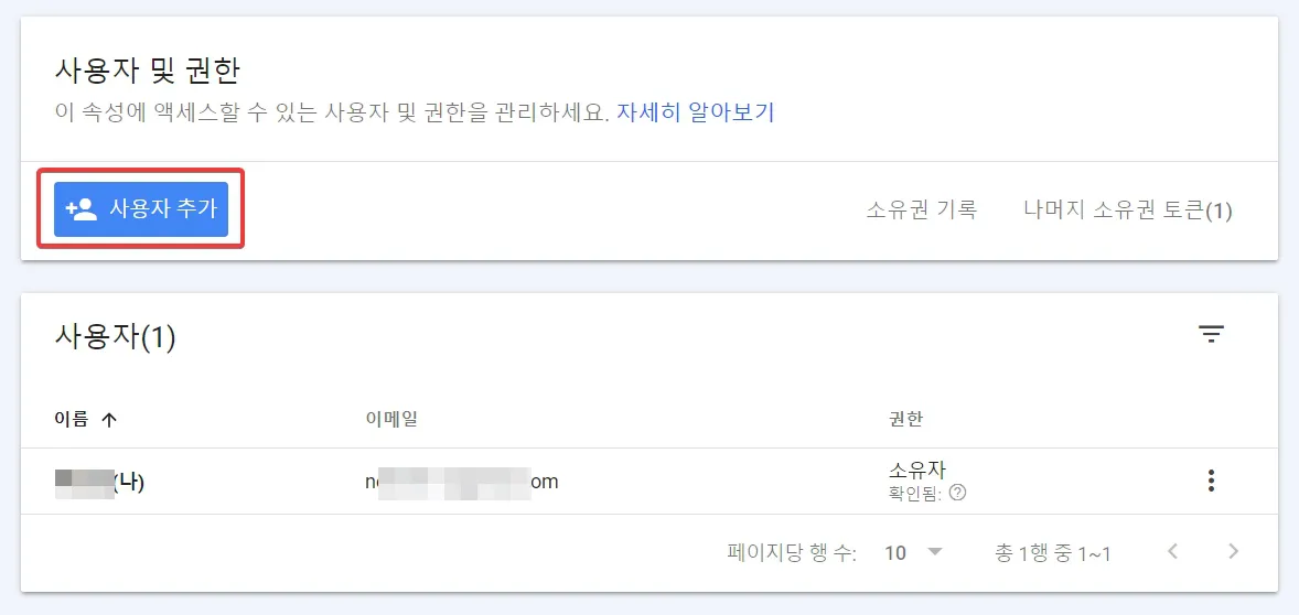 기존에 사용하고 있던 서치 콘솔에 추가된 구글 계정을 연결시키는 방법은 방법은 기존 서치 콘솔의 설정에서 [사용자 및 권한]을 새로운 사용자를 추가하고, 인증 절차를 거치면 연결이 완료됩니다.