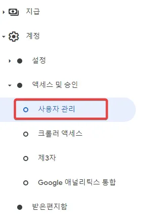 먼저 기존 애드센스 계정에 로그인 해서 애드센스 좌측에 메뉴 중에서 [계정] - [액세스 및 승인] - [사용자 관리]을 선택합니다.