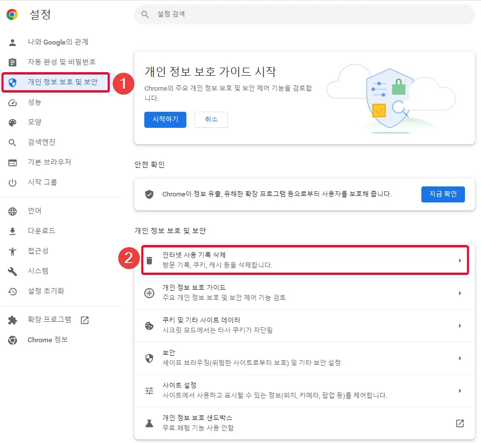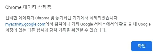 구글 웹 브라우저 크롬(chrome)의 설정페이지에서 - [개인 정보 보호 및 보안] - [인터넷 사용 기록 삭제]을 선택해도 됩니다.