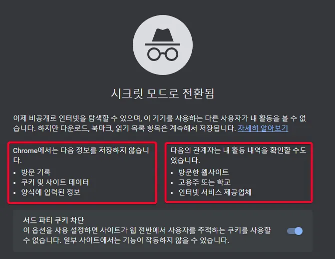 이 기능은 공용으로 사용하는 컴퓨터에서 다른 사용자가 나의 검색기록을 못보는 것이지, 검색엔진이나 서버에서는 나의 활동이 기록되고 확인 할 수 있습니다.
