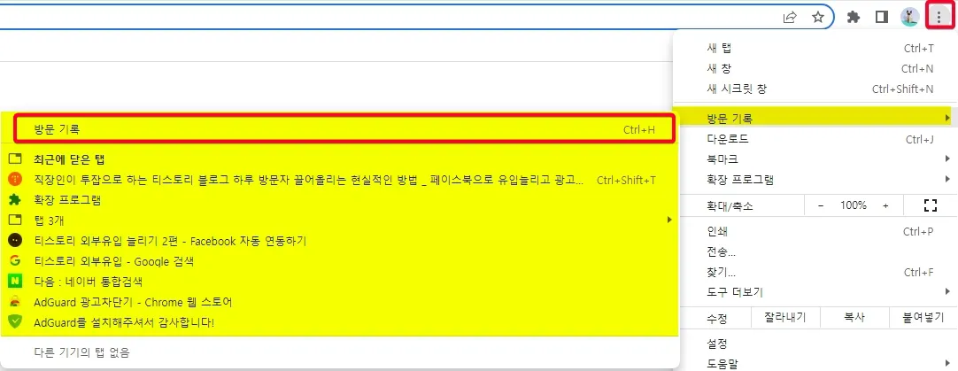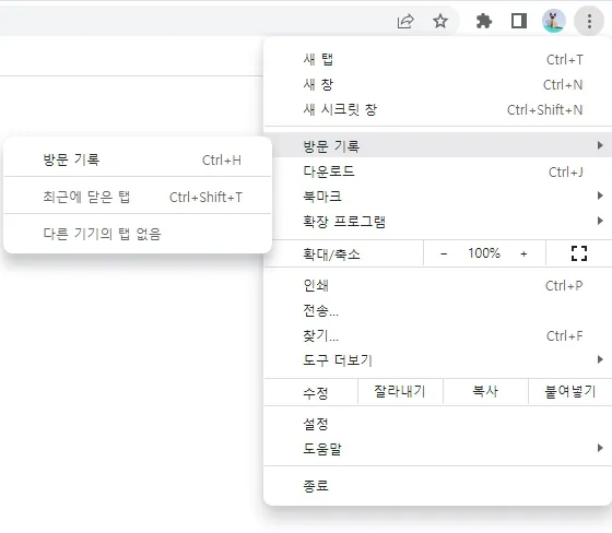 구글 웹 브라우저 크롬(chrome)의 우측 상단에 있는 [더보기(점3개)]를 눌러서 방문 기록을 확인하고 삭제 할 수 있습니다.