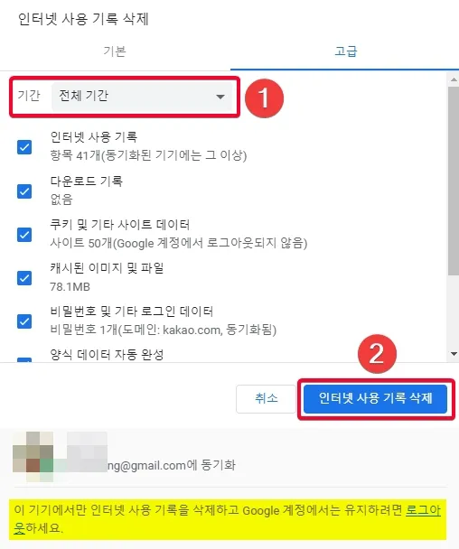 크롬(chrome)을 이용하여 구글에 로그인 되어 있는 상태로 인터넷 사용 기록 삭제를 진행할 경우 구글 서버에 저장되어 있는 기록까지 삭제됨니다.