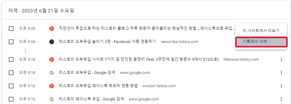 방문기록에 있는 리스트 앞에 있는 체크박스를 체크해서 한번에 여러개를 삭제하거나, 하나씩 삭제할 수 있습니다.