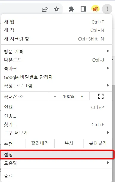 구글 크롬(Chrome) 브라우저에 홈으로 이동하는 버튼이 보이도록 설정하려면 브라우저 우측 상단에 있는 점 3개를 누른 다음 설정을 선택해 주세요.