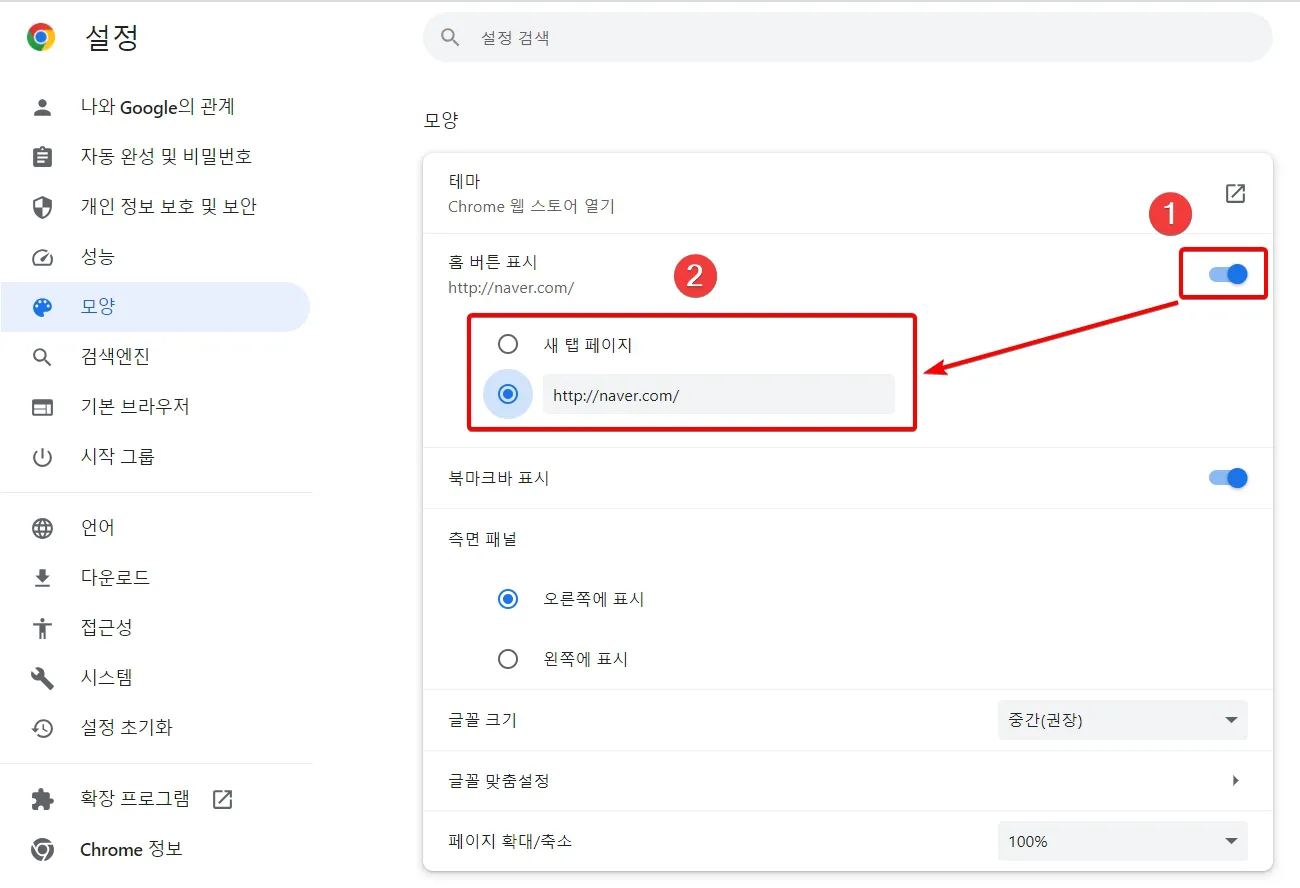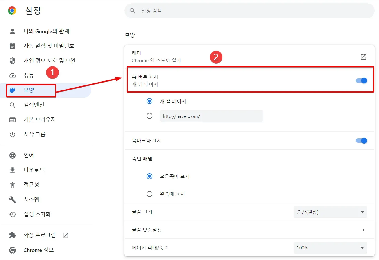 크롬 브라우저 설정 화면에서 [모양]을 선택하면 인터넷 주소 입력란 옆에 홈 버튼이 보이도록 설정할 수 있는 메뉴가 있습니다.