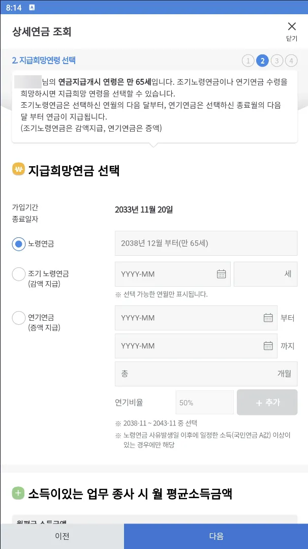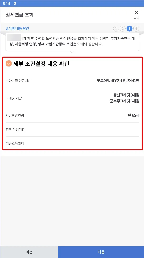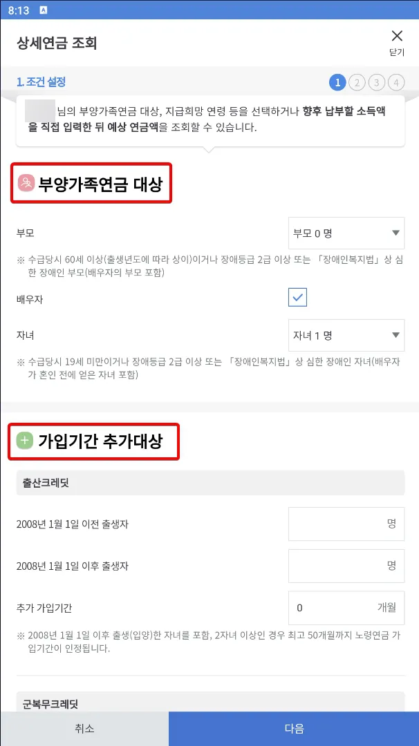 - 부양가족, 출산 및 군복무 크레딧, 국민연금을 받을 수 있는 나이 조건을 설정해서 보다 상세한 예상수령액을 조회할 수 있습니다.