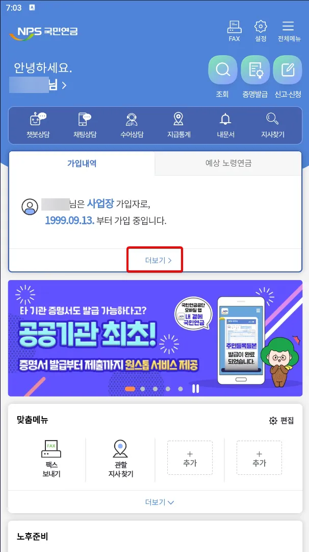 국민연금 모바일 앱 '내 곁에 국민연금' 앱을 설치하고 로그인하면 가입내역, 예상되는 노령연금액을 비롯해서 실생활에 자주 사용되는 주민등록등본 같은 다른 행정기관 증명서까지 모바일 앱으로 팩스, 전자 문서로 발급받을 수 있습니다.