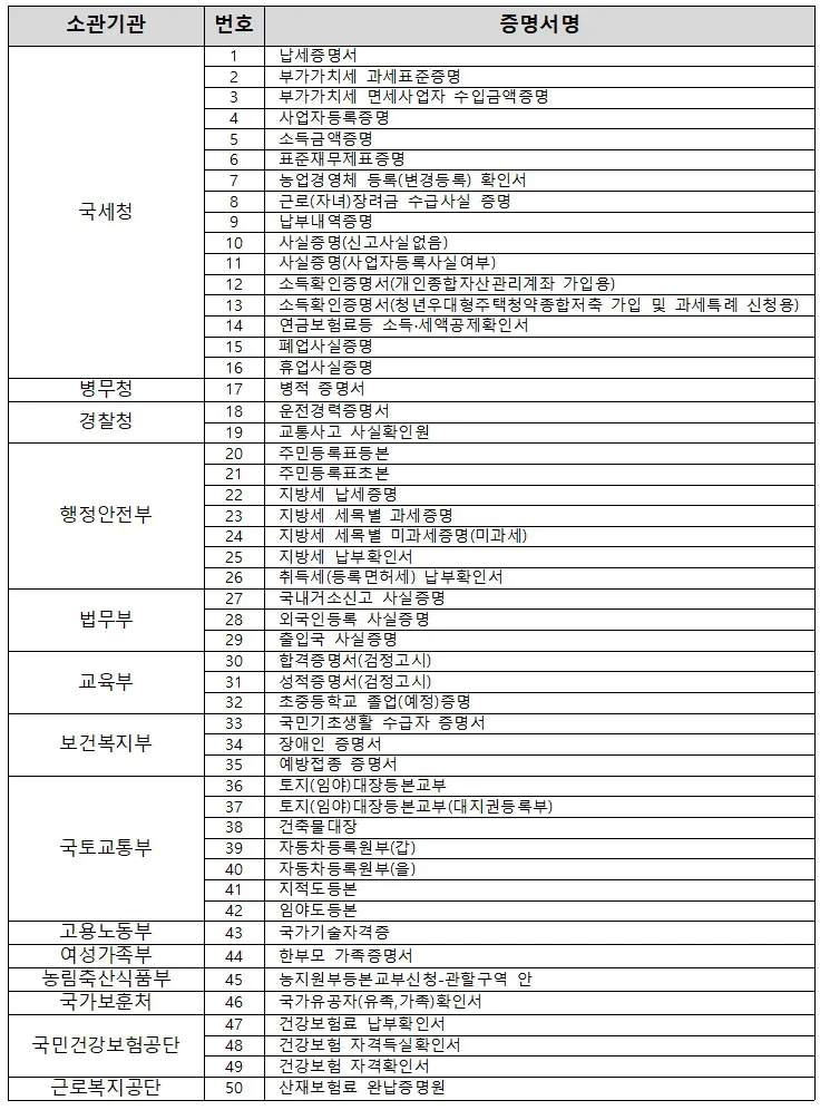 발급 신청 가능한 다른 행정기관 증명서 목록