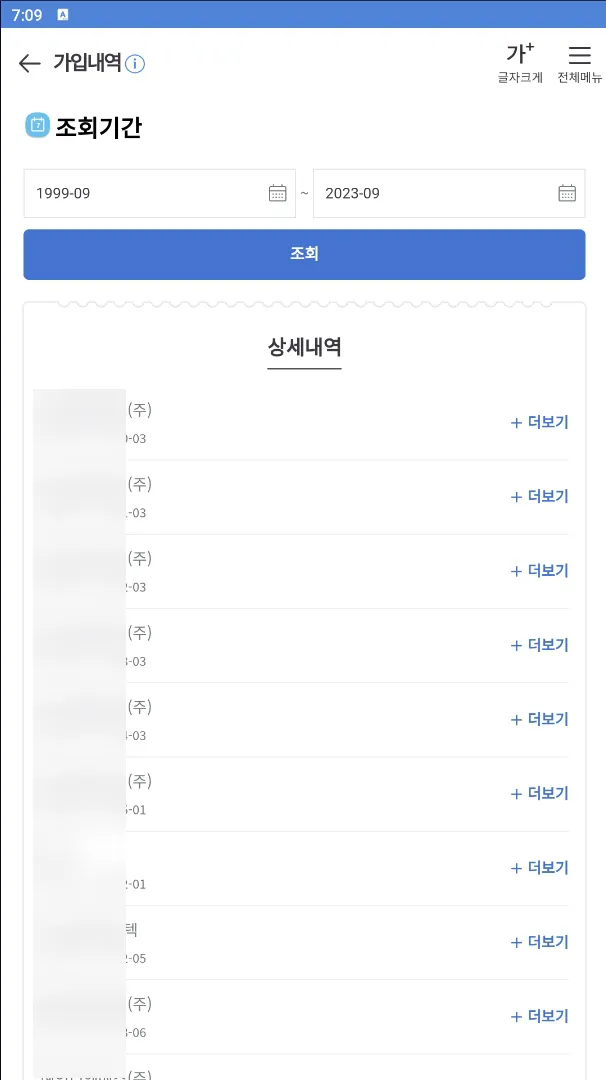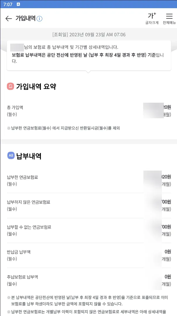 - [가입내역] 탭에 있는 [더보기]를 누르면 요약된 가입내역, 납부내역을 조회할 수 있으며 밑으로 더 내려가면 상세한 납부내역을 확인할 수 있습니다.