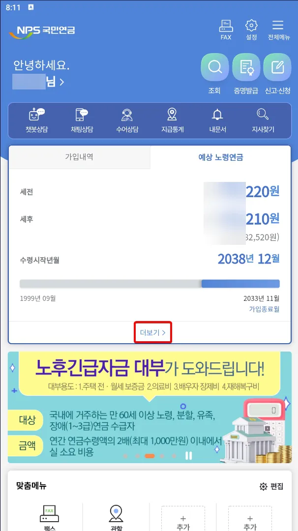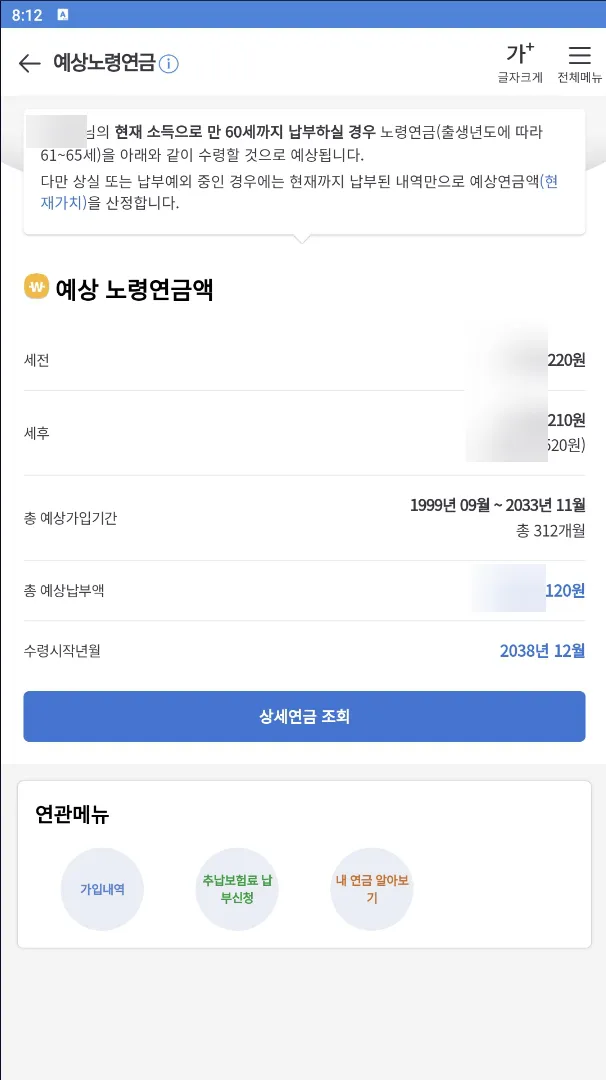| 예상 노령연금액 조회 | 국민연금 예상수령액을 조회할 수 있습니다. |