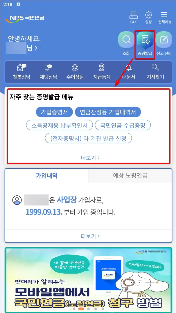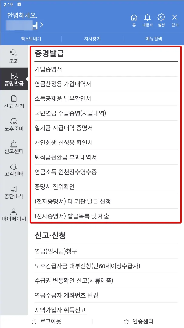 | 각종 증명서 발급 받기 | 각종 국민연금 관련 증명서를 발급, 다른 행정기관 증명서 발급 신청 가능 |