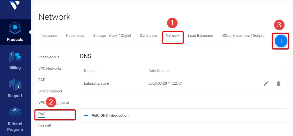 벌쳐(Vultr) 대시보드에서 사용하려는 클라우드 컴퓨팅(가상 서버)을 만든 다음 Network 탭에 있는 DNS를 선택하고 생성된 서버와 도메인을 연결할 수 있습니다.