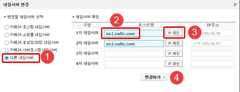 - 다른 네임서버 - 네임서버 이름을 입력하고 IP 확인 후 변경하기 선택