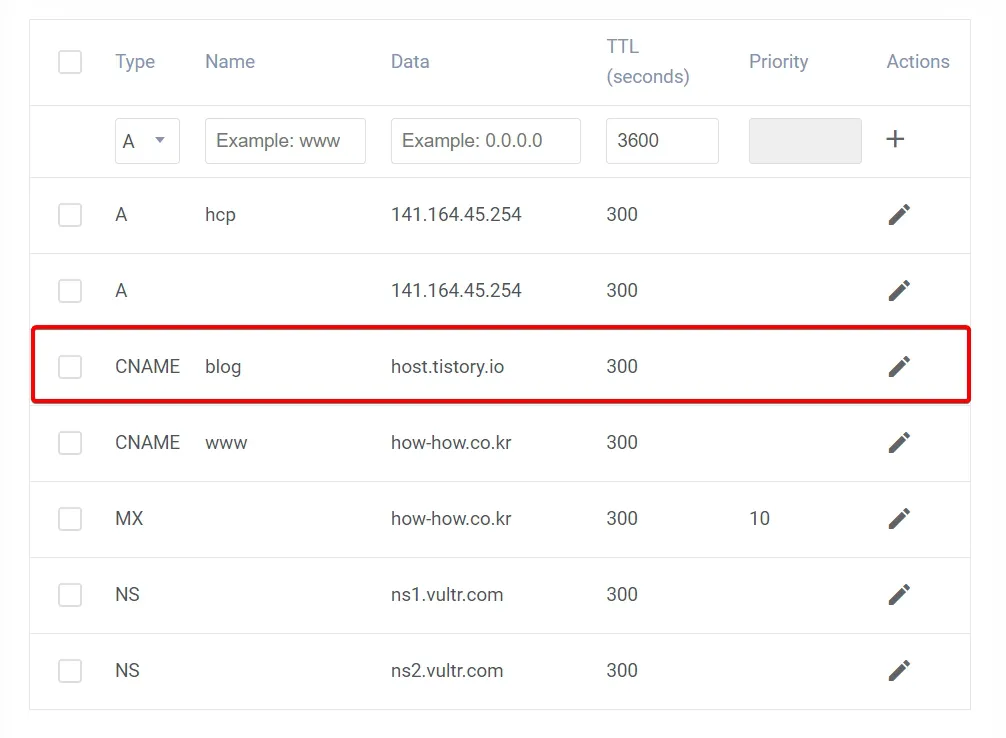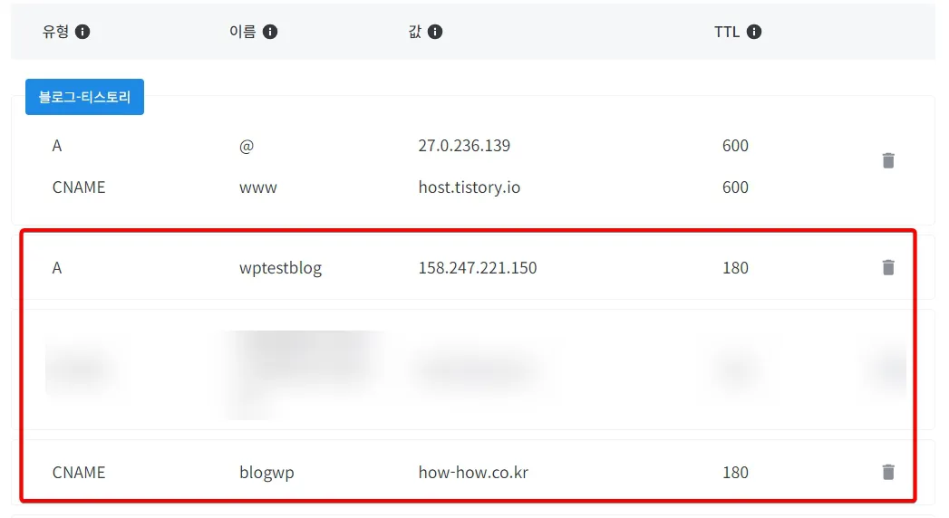 이 과정에서도 티스토리에서 사용 중인 주 도메인의 DNS 설정에 하위 도메인을 추가하고, 추가된 하위 도메인을 워드프레스에 연결합니다.