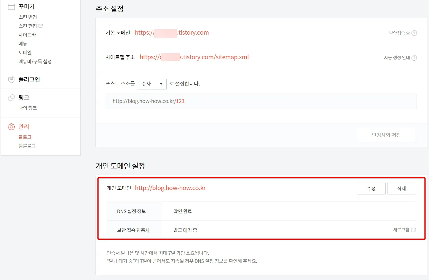 도메인 DNS 레코드를 설정한 다음 티스토리 블로그의 도메인 설정 메뉴로 이동하여, 워드프레스에서 승인받은 도메인을 연결하고 SSL 보안 접속 인증서를 발급받으면 됩니다.