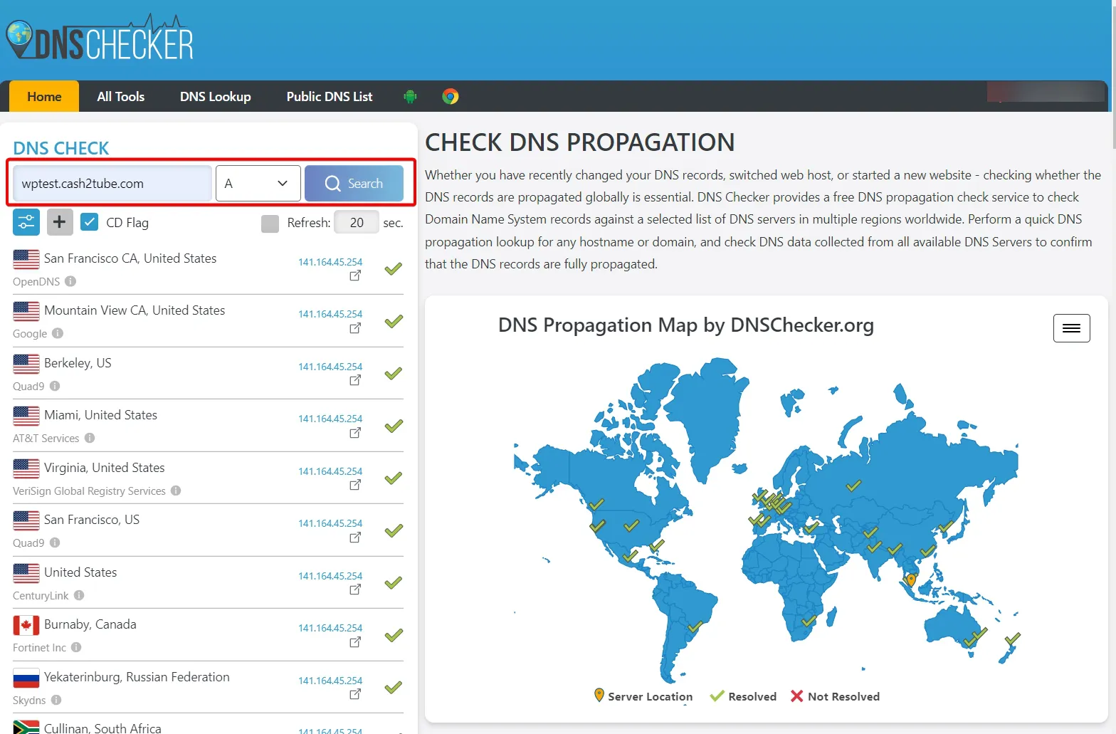 하지만 이 과정에서 주의해야 할 점은, DNS 레코드 변경은 바로 적용되지 않고 일정 시간이 소요된다는 점입니다. 따라서 설정 변경 후 아래의 그림처럼 DNSCHECKER 같은 사이트에서 DNS 레코드가 정상적으로 전파되는지 확인하는 것이 좋습니다.