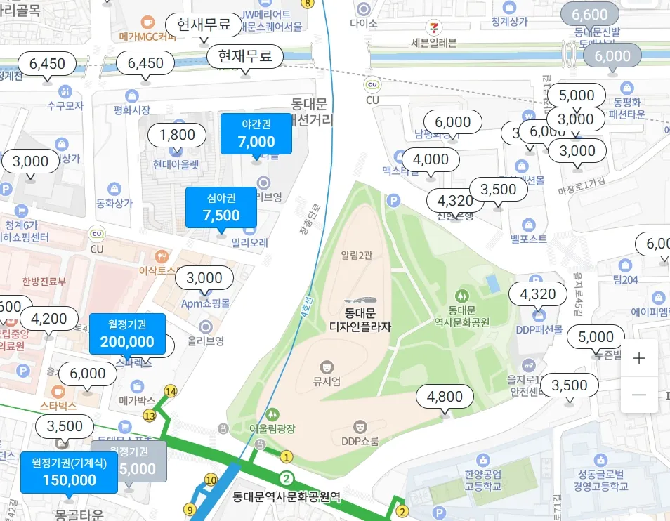 - 동대문 밀리오레 : 30분에 1,500원, 이후 10분당 500원이에요.