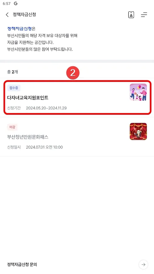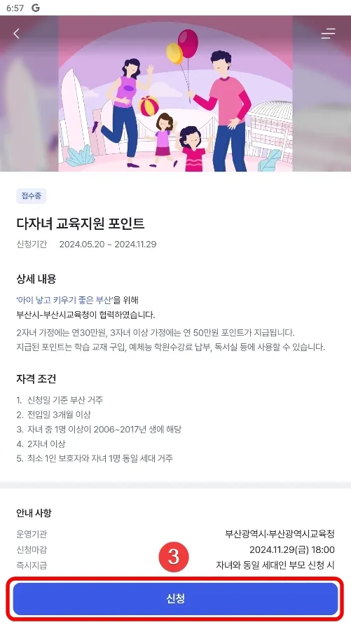 - 신청자격 : 자녀 1명 이상이 2006년 ~ 2017년생인 부산시 다자녀(자녀 2명 이상) 가정