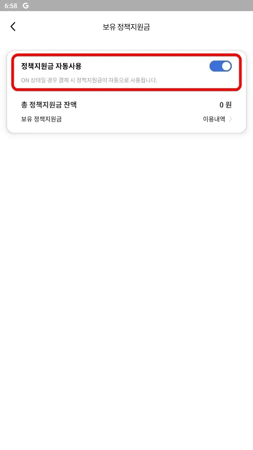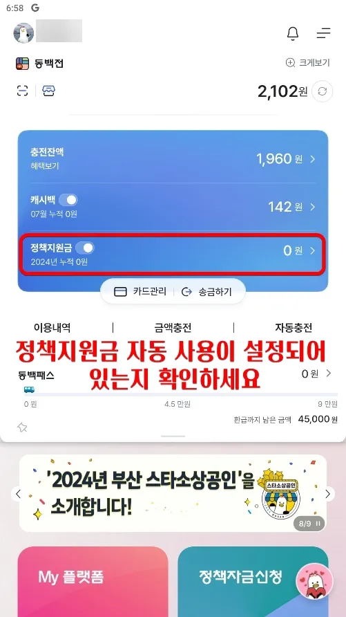 동백전 정책지원금이 정상적으로 사용될 수 있도록 정책지원금 자동사용 설정되어 있는지 반드시 확인해 주세요.