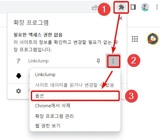 조금 전에 설치한 링크클럼프 Linkclump 옆에 있는 점 3개를 누르면 "옵션"이라는 메뉴가 있습니다. 이 메뉴에서 단축키를 변경할 수 있습니다.
