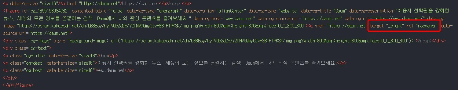 티스토리 블로그 에디터에서 "이전 발행 글 넣기"를 통해서 추가된 링크의 경우 에디터 창에서 "현재 창으로 열기"로 변경은 되지만 rel="noopener" 속성은 그대로 남아 있습니다.