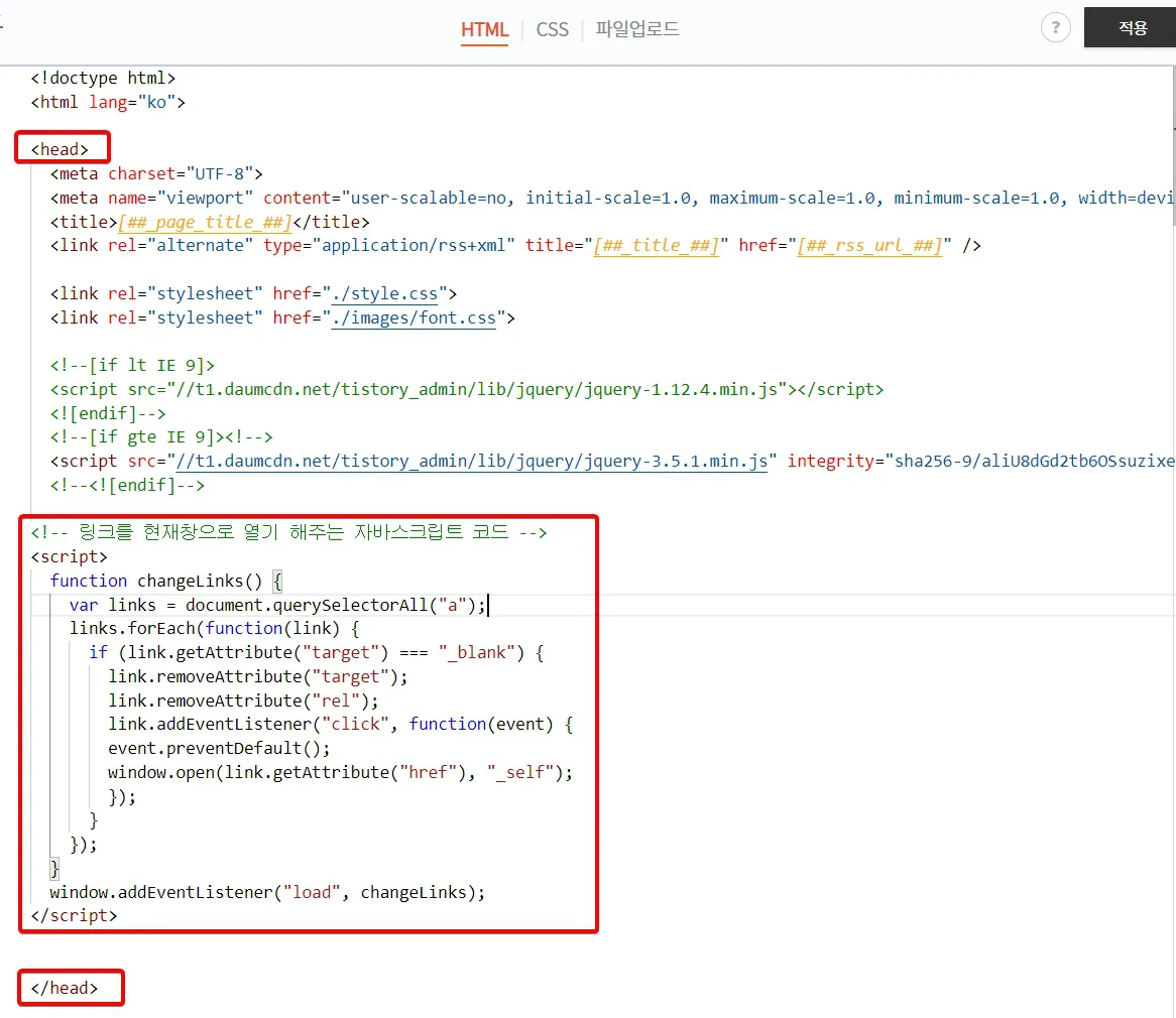 링크를 현재창으로 열기 해주는 자바스크립트 코드 배포