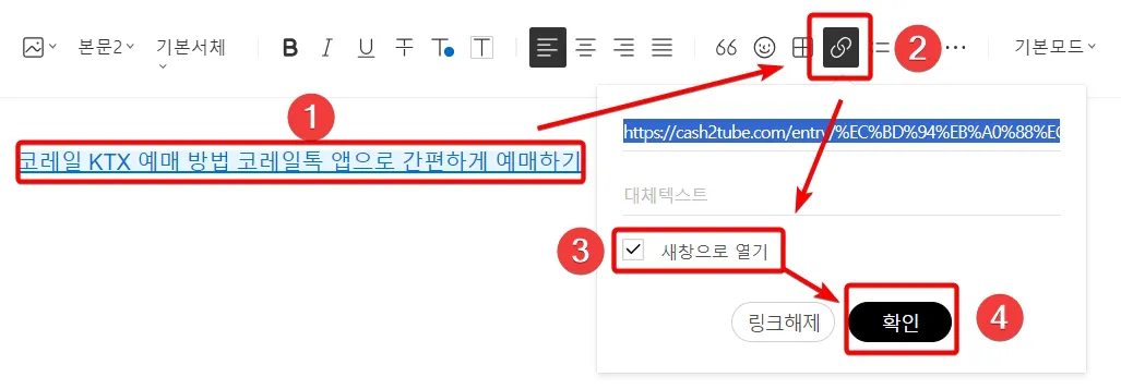미리보기가 가능한 링크 배너를 제외한 4가지 형태는 링크를 추가하면서 에디터 창에서 "새창으로 열기" 옵션에 체크를 해제하시면 "현재창으로 열기"로 변경이 가능합니다.