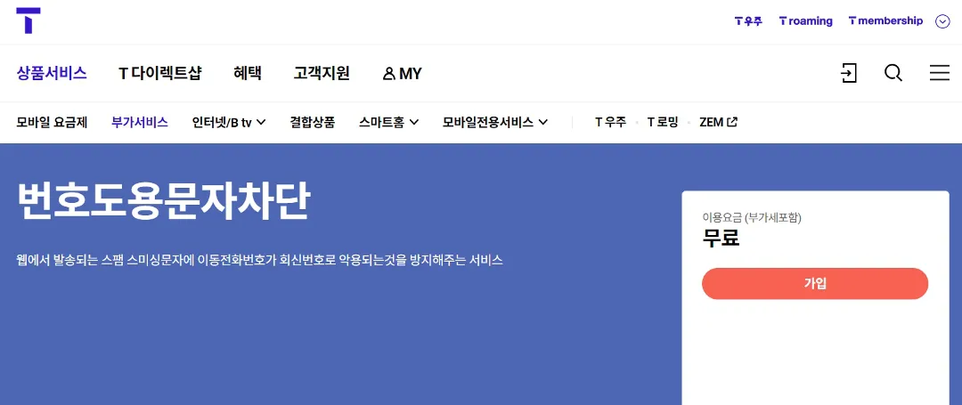 T world 홈페이지에 접속해서 검색창에 "번호도용" 또는 "번호도용문자차단"을 검색하시거나, 해당 부가서비스 바로가기 링크를 이용하시면 바로 가서 신청해고 가입할 수 있어요.