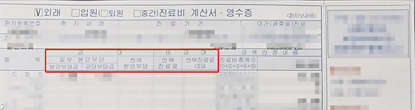 우리가 병원 진료를 받고 내는 병원 진료비 영수증을 살펴보면 크게 급여, 비급여로 나누어져 있습니다. 급여 부분은 본인부담금, 공단부담금(국민건강보험공단), 전액 본인부담으로 구성되어 있습니다.
