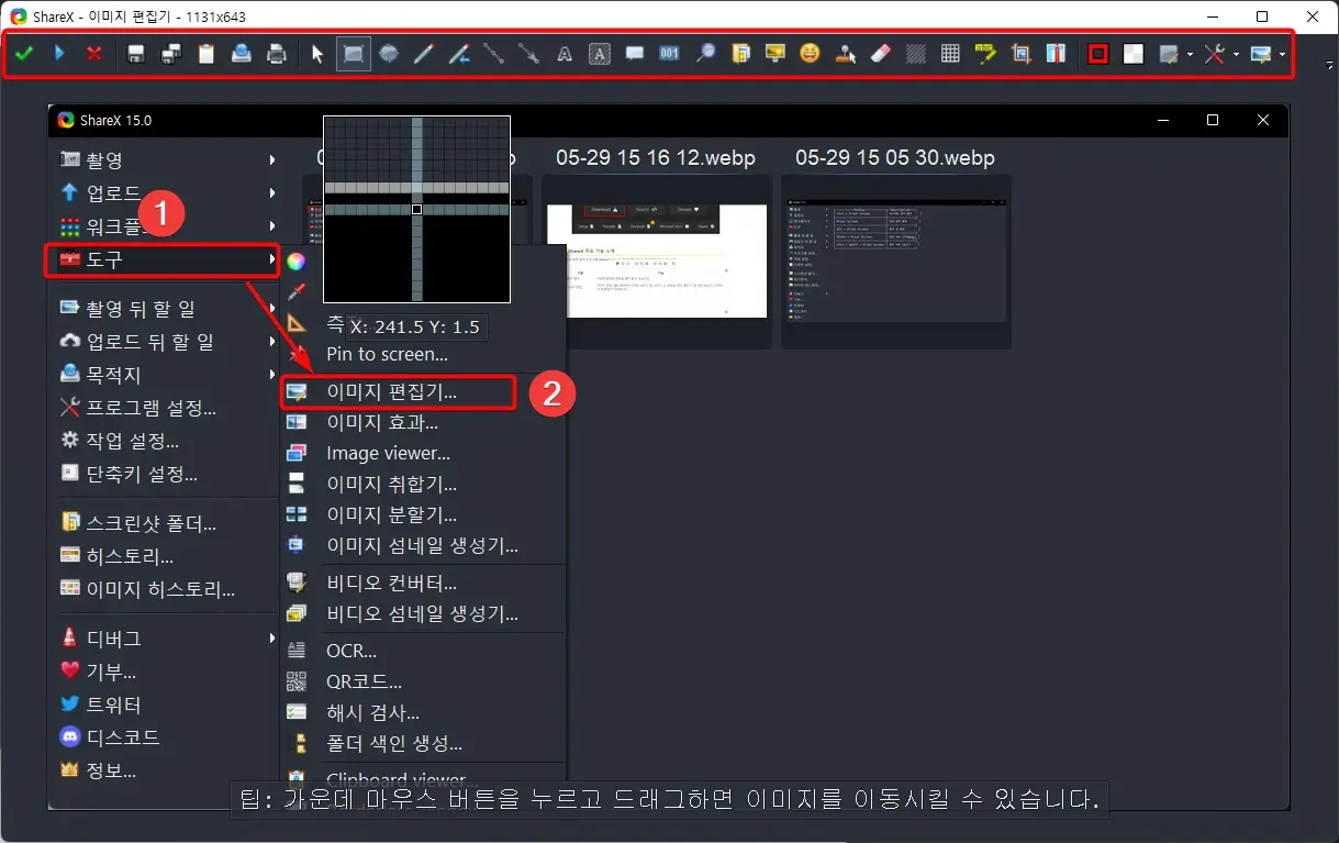 아래에 보시는 이미지도 화면 캡처 후 sharex 이미지 편집기를 사용하여 만든 것으로 매우 다양한 도구들이 있어서, 한 번에 캡처하고 순서를 보여주기 위해서 번호를 매기고, 화살표를 추가하는 등 바로 이미지 편집까지 끝낼 수 있으니 시간 절약에 도움이 됩니다.