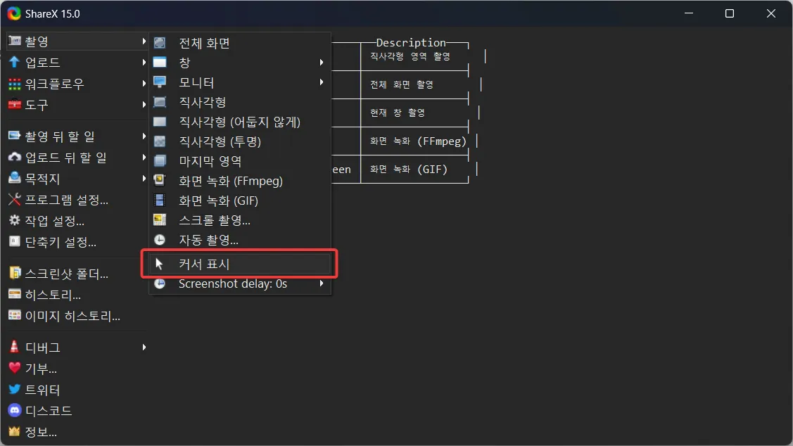 | 커서 표시 | 캡처시 마우스 커서의 표시 여부를 선택합니다. |