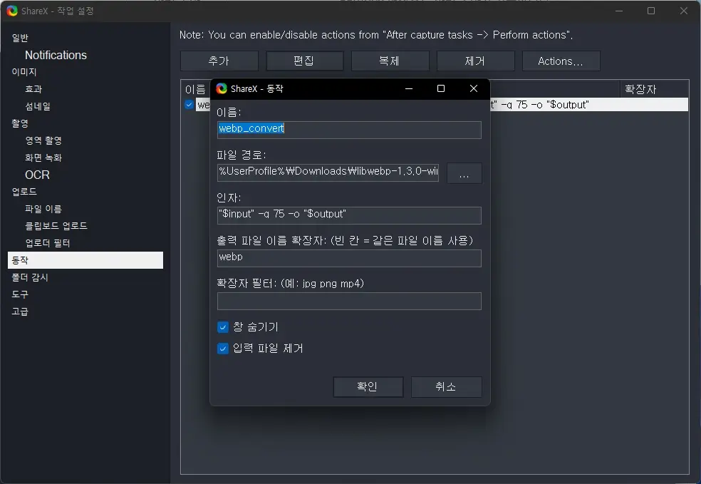 ShareX와 구글 Webp 라이브러리를 사용해서 webp 이미지 자동 생성