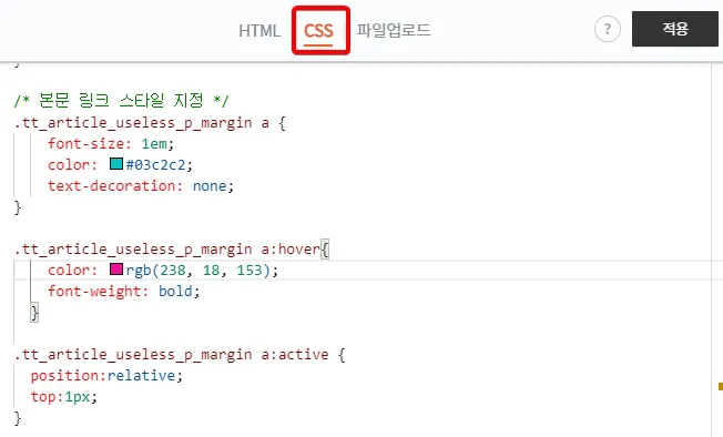 미넴스킨에 적용되어 있는 링크 스타일의 색상을 제거했으니 본문에서 사용할 새로운 링크 스타일 코드를 CSS 편집창에서 가장 하단에 추가하면 링크 스타일 변경이 완료됩니다.