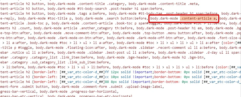 - 방금 삭제한 ".content-article a," 을 검색해 보면 다크모드에서 사용되는 링크 스타일 " body.dark-mode .content-article a,"를 찾을 수 있으며, 이 코드 역시 삭제합니다.