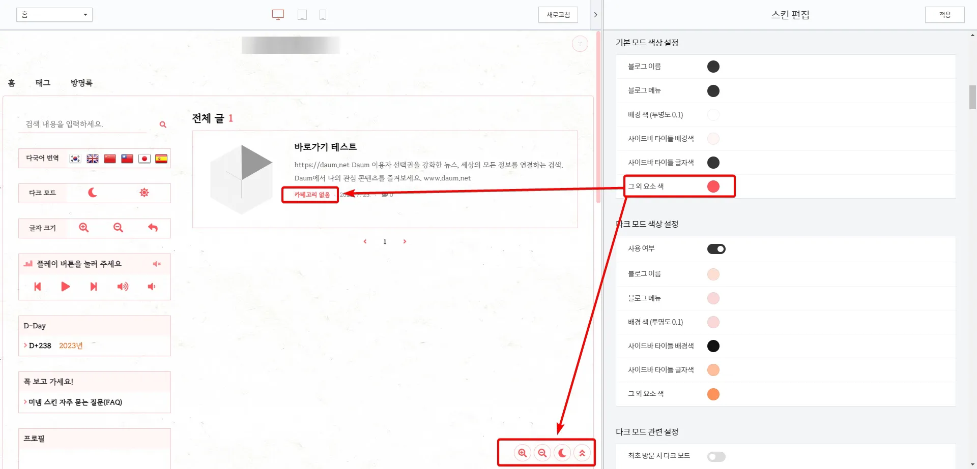 티스토리 관리 페이지에서 좌측 하단에 있는 [꾸미기] - [스킨편집]을 눌러서 스킨 편집을 할 수 있는 페이지에서 보시면 기본 모드 색상을 선택할 수 있으며, [그 외 요소 색]이 미넴스킨의 테두리를 비롯한 링크 스타일 색상까지 지정되는 옵션입니다.
