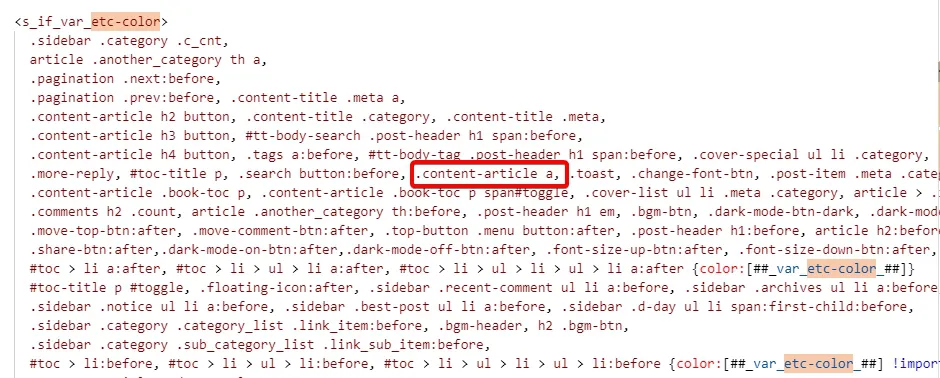 - HTML 편집 모드에서 "etc-color"를 검색하면 <s_if_var_etc-color> 코드 아래에 있는 ".content-article a," 라는 부분을 찾아서 [컨트롤+X]로 삭제