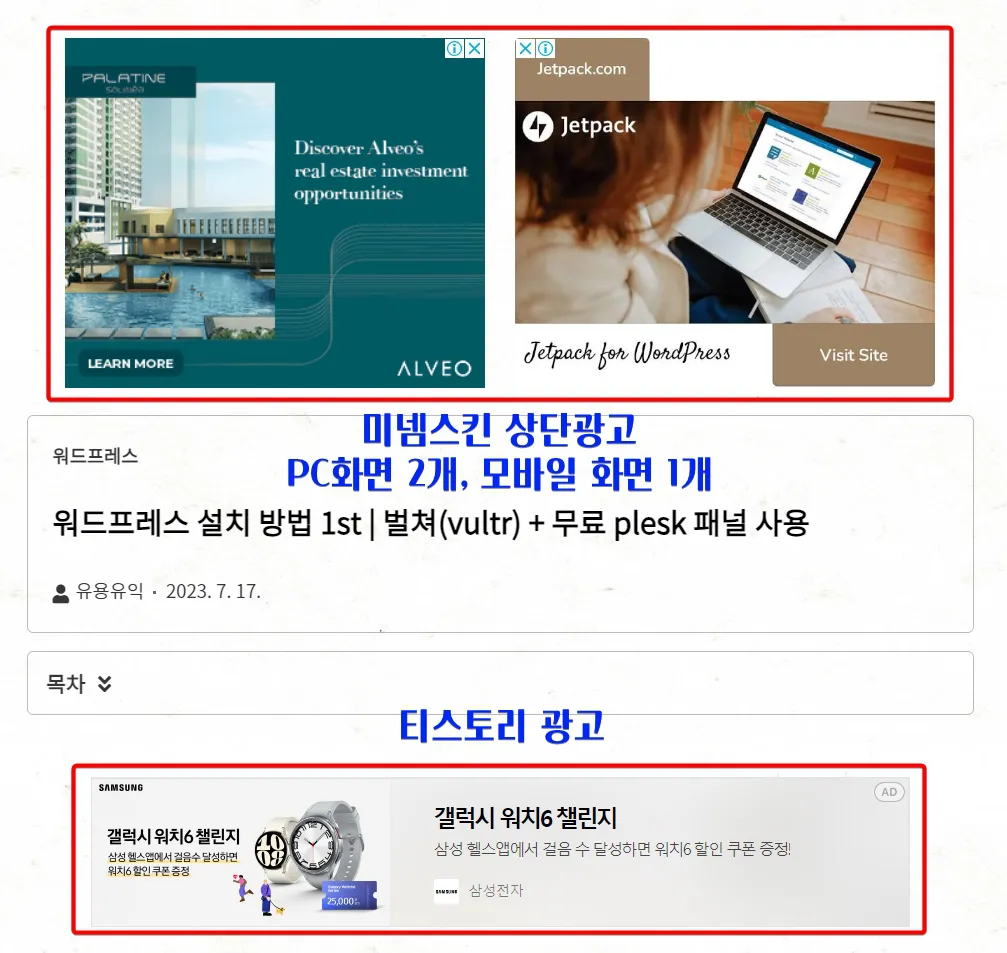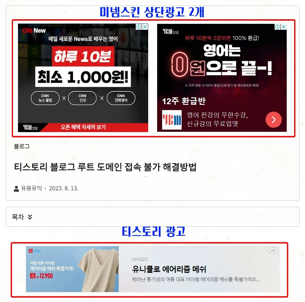 미넴스킨 상단광고 2개를 출력하는 HTML 코드를 이동시킨 후 아래의 그림처럼 제대로 출력이 되는지, 티스토리에서 추가한 광고와 충분하게 거리를 두고 있는지 확인해 보세요.